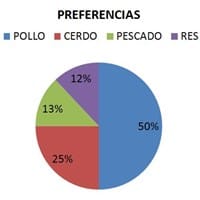 Se observa un diagrama circular donde se muestra los siguientes porcentajes : pollo 50%, Res 12%, Cerdo 25%, Pescado 13%.