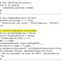 H o l a: Te paso la macro: Para generar el PDF, cambia el nombre del listbox por el tuyo Private Sub CommandButton1_Click() If ListBox1.ListIndex = -1 Then MsgBox "Seleccione una hoja", vbInformation, "AVISO" Exit Sub End If Set h =...