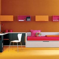 La habitación la puedes pintar de color amarillo pastel u ocre claro. El cabezal lo puedes tapizar de color naranja-teja, tirando a marrón. Resultará un ambiente cálido y acogedor.