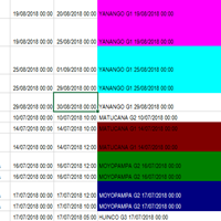 Estoy intentado crear una macro que me analice lo siguiente: Tengo la columna A, B, C, D, E, F, G y como ven las fechas que están en amarillo están dentro del rango de las de color celeste, cómo sería para eliminar toda la fila de los amarillos ya...