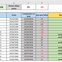 SOLUCIÓN Primero la imagen y luego la explicación: Fórmulas en cada celda: A1: =HOY()En C1 y D1 coloque el intervalo de días a comparar, o sea 15 y -15En C3 : ="Cumpleaños en "&AÑO($A$1)C4 y siguientes hacia abajo:...