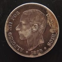 ¿Cuánto vale una moneda de 5 pesetas de plata Alfonso XII 1885 MS. M.?