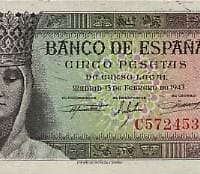 Emisión de 13 de Febrero de 1943. Serie única de billetes de cinco pesetas con tamaña 100 por 50 milímetros e impresos sin letra de serie y letras de serie de la A a la J. Te dejo dos fotos de las dos caras del billete. Los valores son 45-80-180...